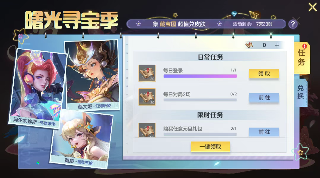 1月1日-1月9日,曙光寻宝季活动开启,玩家参与活动或通过商城获取藏宝图,即可兑换传说皮肤阿尔忒弥斯·电音未来、蔡文姬·幻海听鲛、黄泉·至尊节拍,还有孙悟空·斗战胜佛、陆逊·青衫烟雨客、艾璐妮·玲珑之芯等更多皮肤,爆竹声声头像框、龙魂祈福卡、皮肤碎片、排位守护卡等好礼。