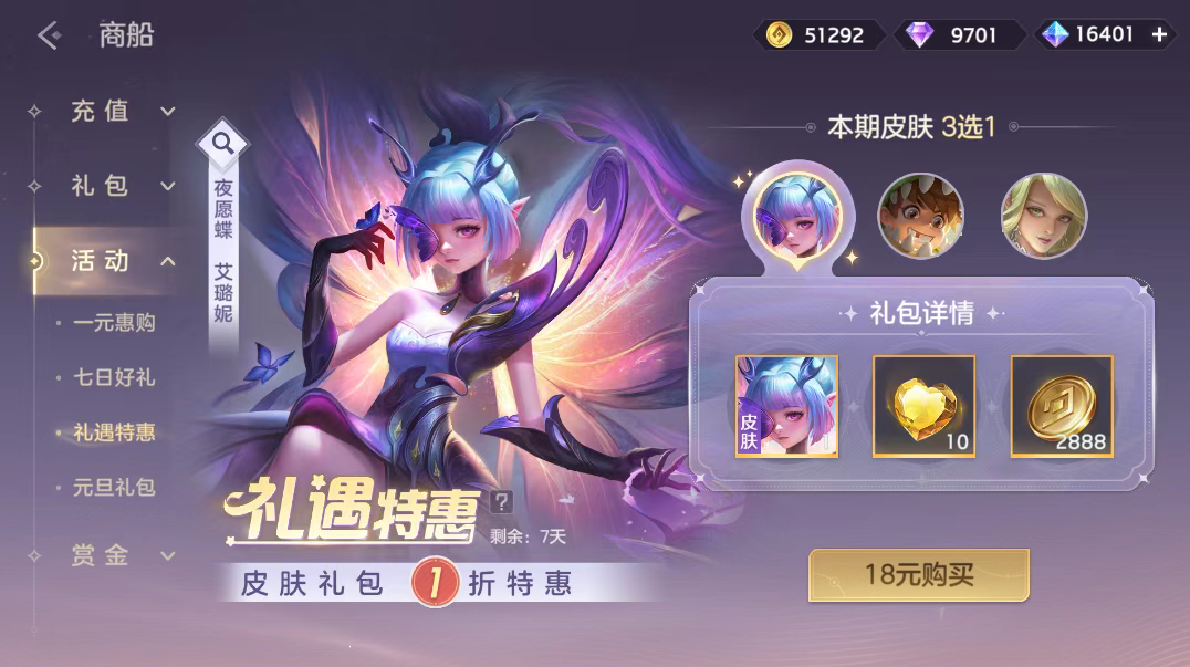 1月1日-1月9日,礼遇特惠礼包限时1折,仅需18元玩家即可在艾璐妮·夜愿蝶、鳗鳗·玩具大亨、西施·人偶新娘三款皮肤中进行超值3选1。