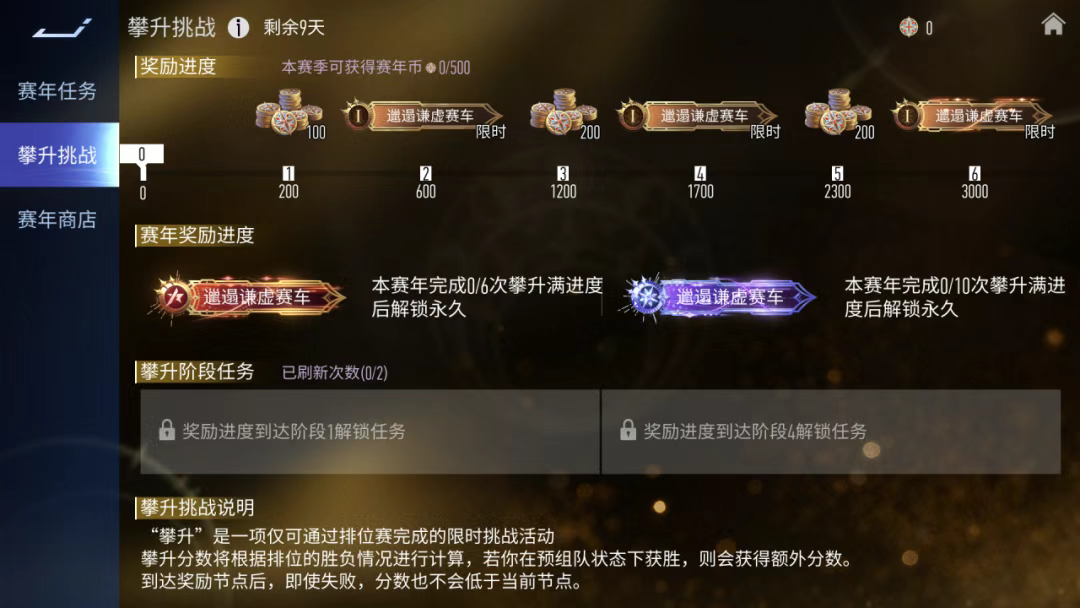 参与每赛季末开放的攀升挑战,累积一定的攀升点数也可获得赛年币奖励。每个赛季可获得的赛年币数量存在上限,当超出上限时,再次获取的赛年币将自动转化为同等数量的排位币。