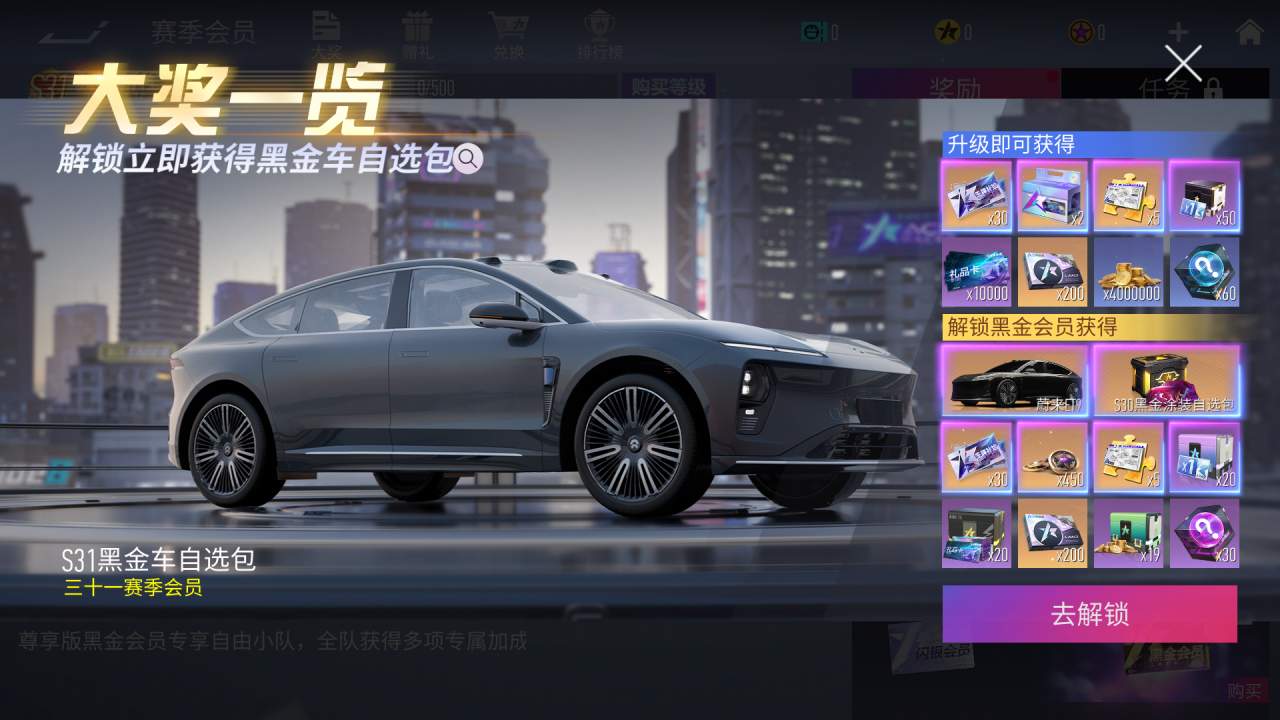 1月16日,赛季会员开启,玩家开通黑金会员可领取S31黑金车:蔚来ET9,若玩家升级赛季会员等级可以额外领取王牌补给券、传说蓝图碎片、纪念币等多种资源奖励!