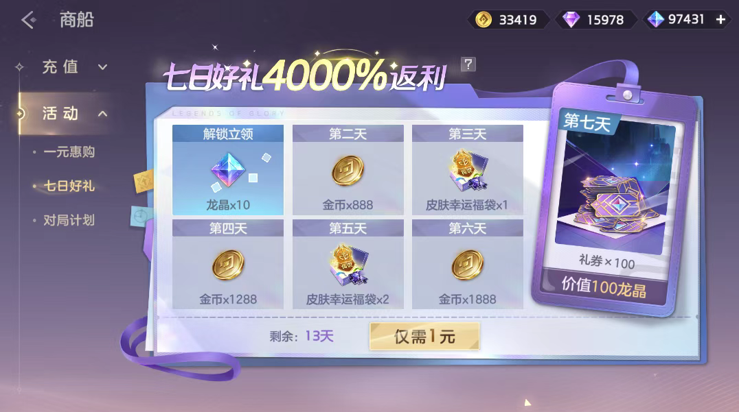 1月19日-2月2日,七日返利活动开启,玩家付费1元解锁登录活动,登录游戏即可获得龙晶*10、皮肤幸运福袋(必得皮肤碎片*2,概率额外获得传说皮肤自选箱)、金币奖励,累计登录7天可得礼券*100。
