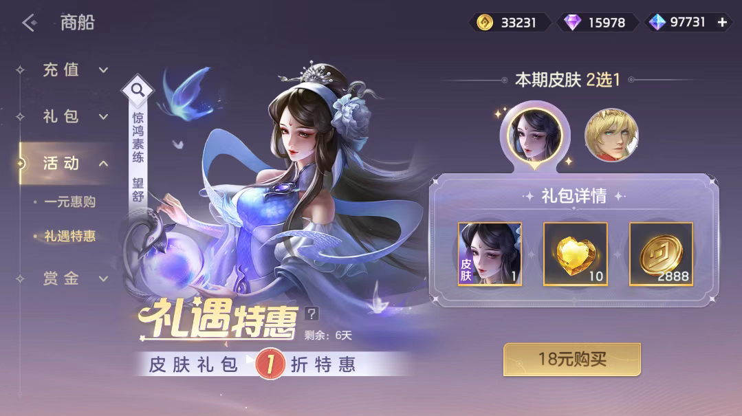 1月16日-1月23日,礼遇皮肤礼包限时1折,仅需18元,玩家即可在望舒·惊鸿素练、赵云·神圣王骑两款皮肤中进行超值2选1。