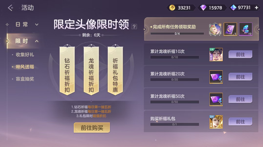 1月16日-1月23日,嘲风送福活动开启。活动期间,钻石祈福及龙魂祈福限时每日首抽5折,祈福礼包限时特惠,完成任务获取限定头像繁花满袖·西王母等奖励。