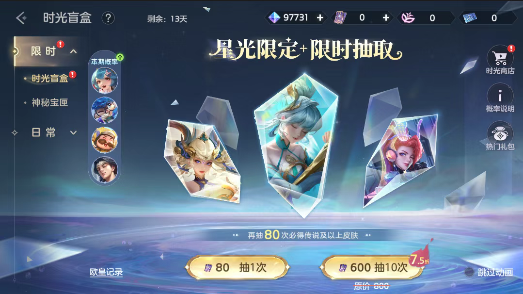 1月16日-1月30日,时光盲盒开启,玩家使用礼券或时光专票抽奖,10次(含)抽奖必得随机品质皮肤,前20抽(含)抽到传说及以上品质皮肤将获得欧皇称号。还有星光限定皮肤精卫·异海蕴螭吻、铁扇公主·妙音谱囚牛,传说皮肤阿尔忒弥斯·电音未来、特斯拉·电玩总动员等奖励在等你来抽。