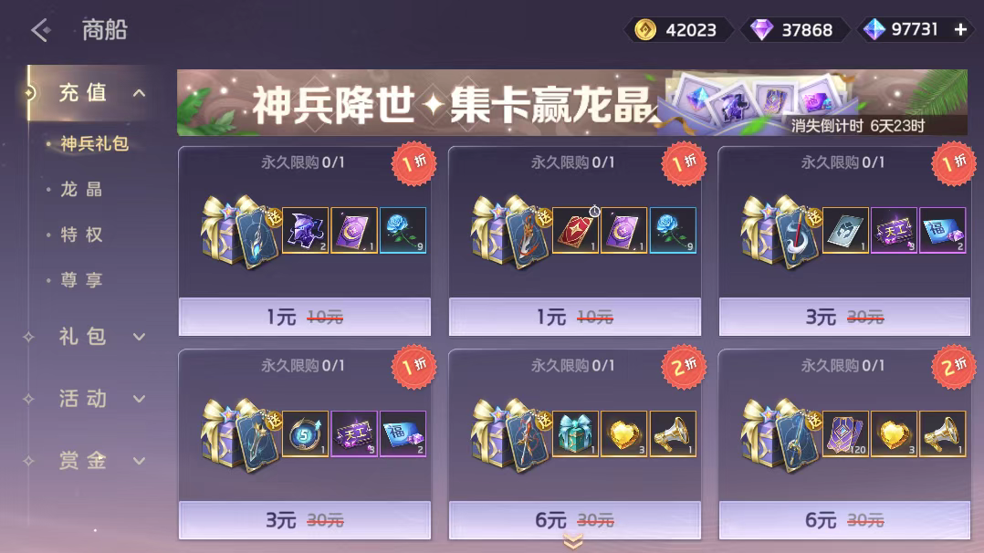 1月23日-1月30日,神兵礼包限时直售,神兵卡片、礼券、橙心钻、聊天框自选箱、5级绘卷经验包、大喇叭、钻石祈福卡、改名卡、排位守护卡、皮肤碎片、神兵保养卡等你来拿!收集神兵卡片可在收集好礼活动领取奖励。