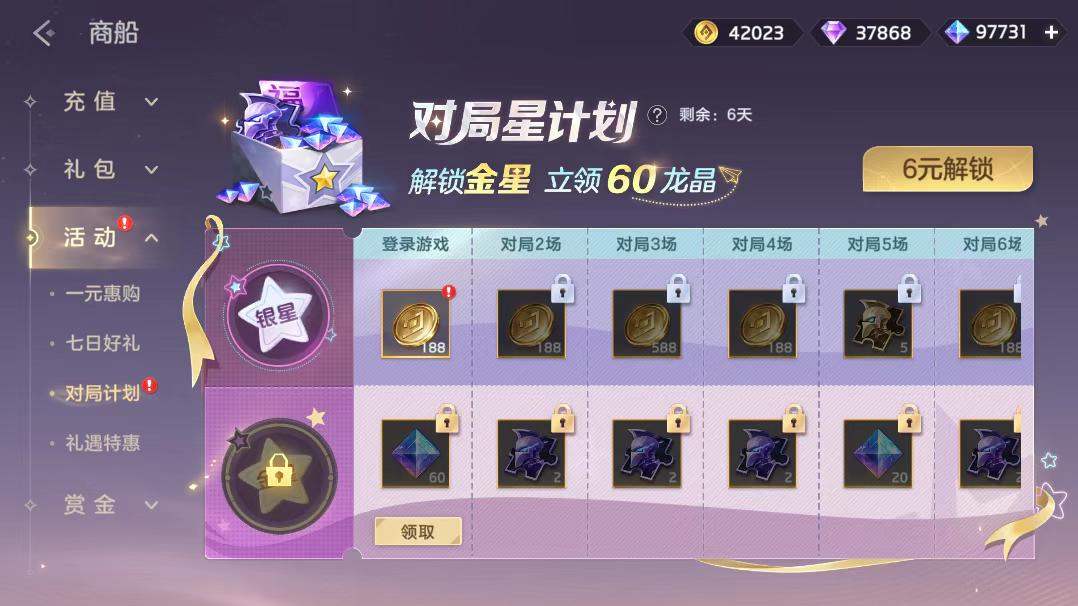 1月26日-2月2日,“对局计划”活动开启,玩家完成对局任务,提升等级免费获取英雄碎片、金币,付费6元解锁金星可以获得龙晶*120、龙魂祈福卡、皮肤碎片。