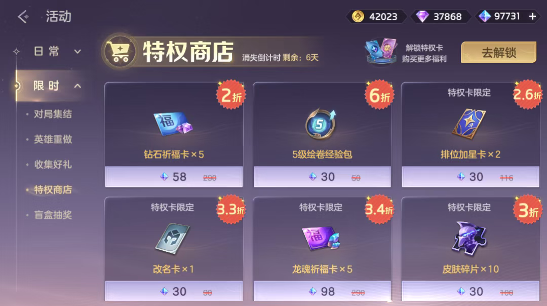 1月28日-2月4日,特权商店开启,玩家解锁特权卡,享受超值折扣,龙魂祈福卡、排位加星卡、皮肤碎片、改名卡等你来购。
