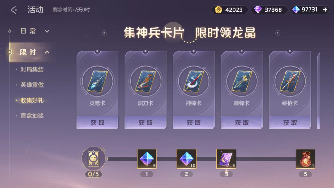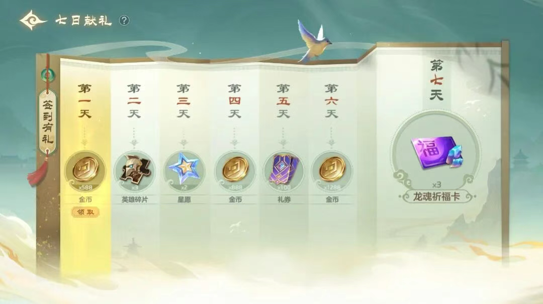 1月23日-2月5日,“七日献礼”活动开启,玩家每日登录即可领取龙魂祈福卡、礼券、星愿、英雄碎片等奖励。