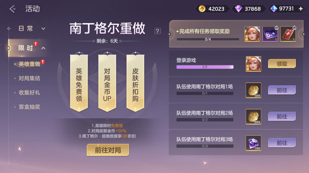 首先在1月23日-1月30日,南丁格尔迎来重做。活动期间玩家参与对局,对局结算金币+50%,完成全部任务可以获得英雄南丁格尔、专属皮肤6折折扣券、排位守护卡*1等奖励。
