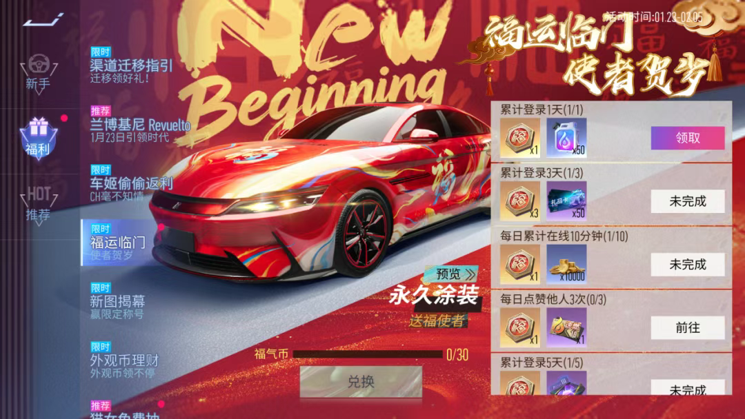 1月23日-2月5日,“福运临门”活动开启,玩家完成任务积攒福气币,达到一定数量即可免费兑换全新涂装-送福使者。