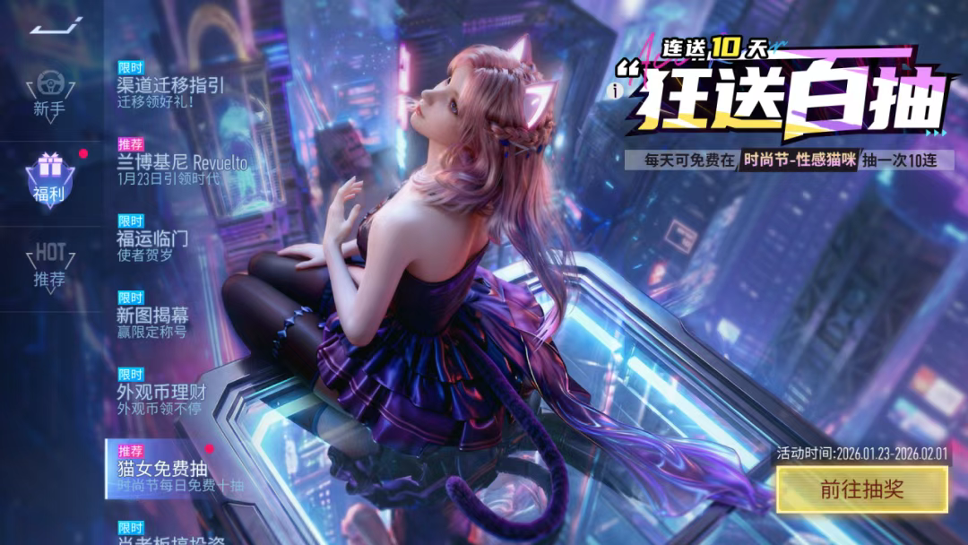 从1月23日,“猫女免费抽”活动开启,在接下来的连续十天里,玩家每天可在时尚节-性感猫咪卡池抽一次免费十连!免费百抽抽到爽!
