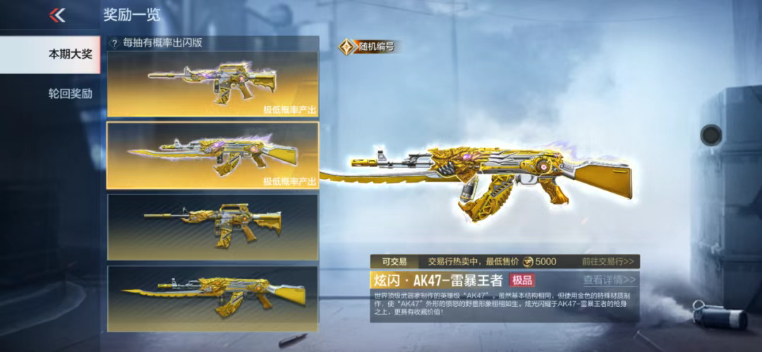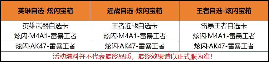 本期奖池中,雷暴王者自选卡可自选的武器不仅有本期王者轮回首发的M4A1-雷暴王者和AK47-雷暴王者,更有新版本迎来加强的其中几款王者武器,包括王者之势、王者之翼、M4A1-雷霆王者、AK47-雷霆王者。