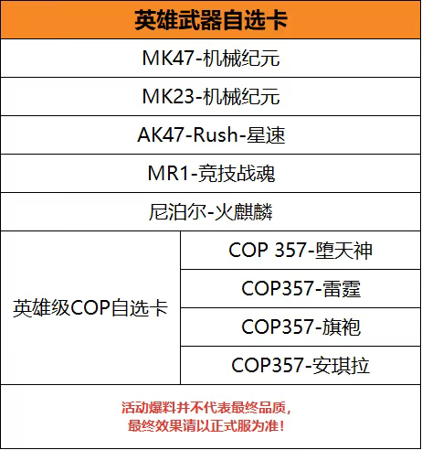 而英雄级武器自选卡中的道具更加丰富,包含有:MK47-机械纪元、MK23-机械纪元、AK47-Rush-星速、MR1-竞技战魂、尼泊尔-火麒麟、英雄级COP自选卡。其中的英雄级COP自选卡中还可以在COP 357-堕天神、COP 357-雷霆、COP 357-旗袍、COP357-安琪拉等COP 357系列武器中任选其一。