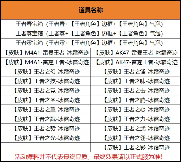 本次王者轮回的兑换奖池中新增M4A1-雷暴王者-冰霜奇迹、AK47-雷暴王者-冰霜奇迹、王者“春”宝箱!
