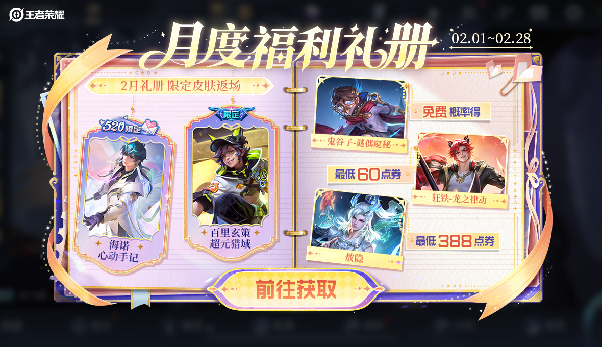 在2月1日-2月28日,2月礼册开启,新一期月度福利礼册的免费皮肤奖池任务、任务奖励、奖池内容均不变,1月如果没有刷到心仪奖励,接下来的礼册都还有机会哦。