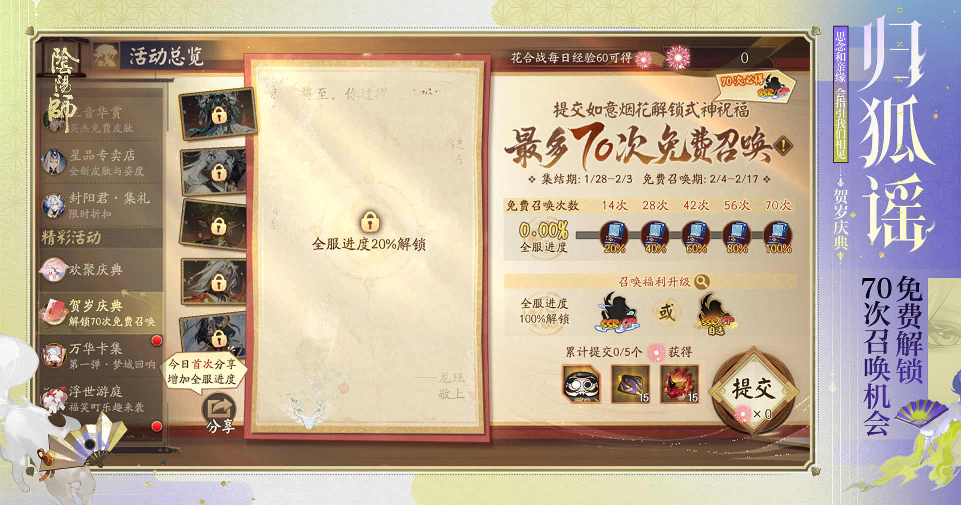 阴阳师贺岁庆典活动开启,玩家参与活动即可获取最多70次免费召唤奖励,还有必得自选SSR/SP式神福利,在活动期间,每日花合战活跃值达到60可获得「如意烟花」,提交后可增加全服进度,解锁免费召唤次数和式神祝福。