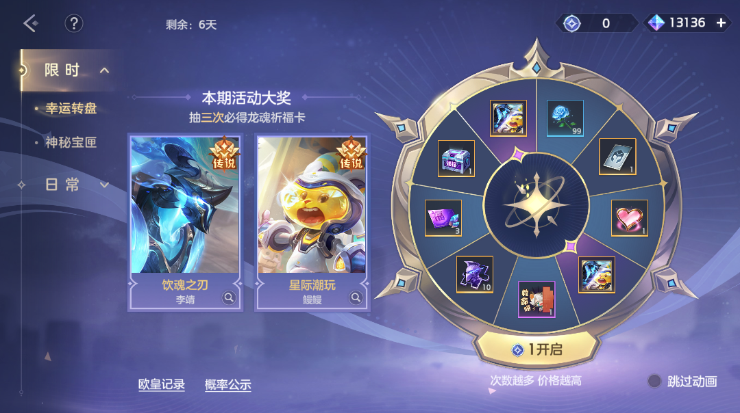 2月2日-2月9日,“幸运转盘”开启,玩家使用龙晶购买幸运币进行抽奖。李靖·饮魂之刃、鳗鳗·星际潮玩、播报自选箱、救命呀表情、龙魂祈福卡、皮肤碎片、好感度礼包、改名卡等奖励等你来抽!最多3抽获得龙魂祈福卡,最多6抽获得一款皮肤,最多9抽可获得全部奖励,前2抽抽到皮肤的守护者会获得欧皇称号。