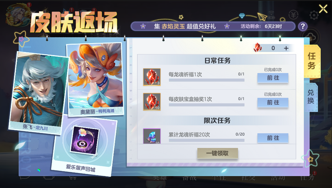 1月30日-2月6日,“皮肤返场”活动开启,玩家通过任务、神秘宝匣、宝匣礼包获取赤焰灵玉,即可兑换张飞·定九川、奥黛丽·鸭鸭海滩、爱乐留声回城、流音织声播报、青花写意头像框、英雄随机箱、奇奇怪怪·奇奇头像、直接起飞表情等好礼。