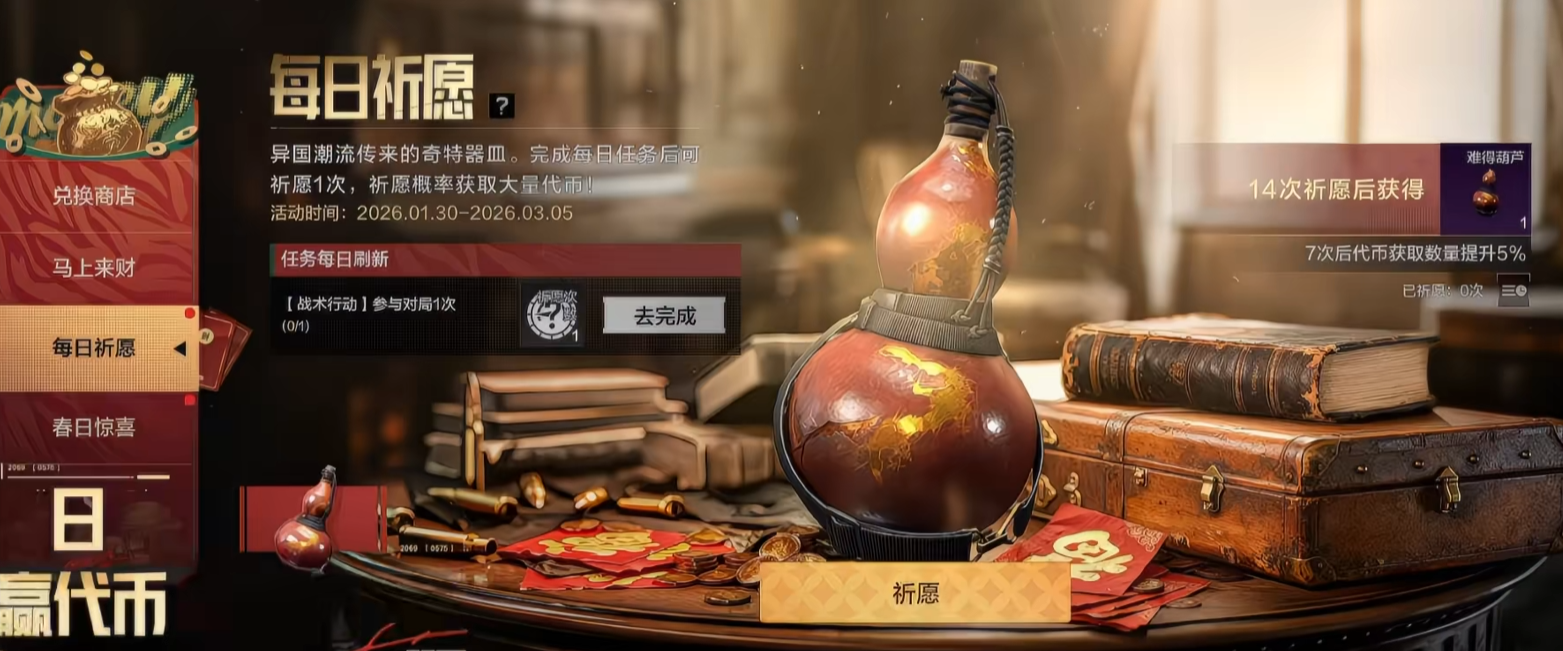 1月30日-3月5日,“每日祈愿”活动开启,玩家完成每日任务后获得1次祈愿机会,祈愿获得大量代币,祈愿一定次数后可获得特殊档案物资!