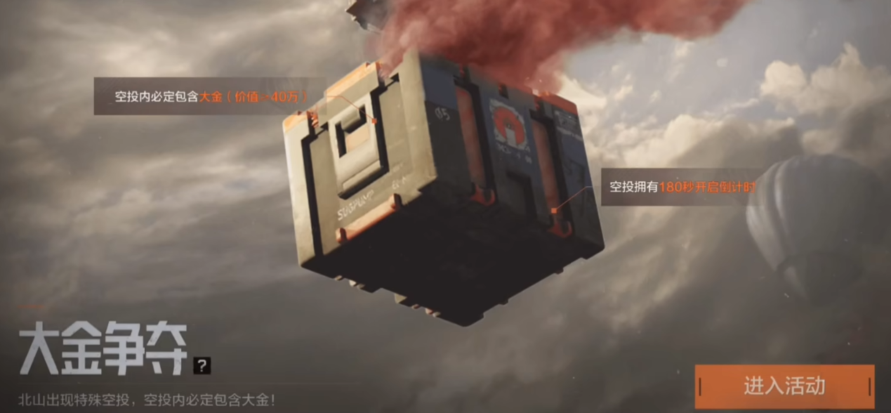 除了活动外,在1月30日-2月26日,“大金争夺”活动限时开启,活动期间,玩家可前往争夺特殊空投,入场需消耗50000柯恩币,身上装备总价≥180000柯恩币。在此模式中所有玩家仅可四人组队进入对局。