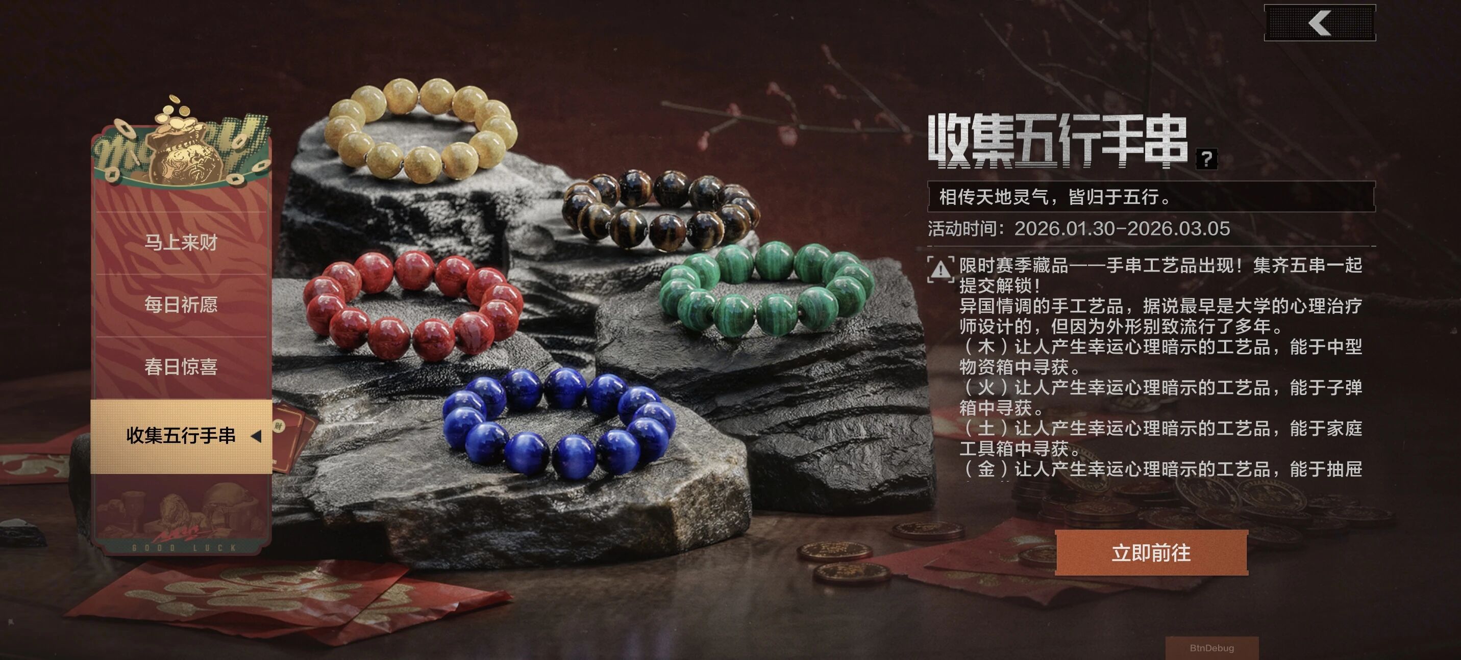 1月30日-3月5日,赛季限定藏品“五行手串”,限时收集开启,活动期间,玩家可在局内指定容器里寻找散落的手串。共有五种颜色,集齐整套并提交,即可解锁特殊档案物资。这五行手串每串都有对应的祝福,集齐它们的人,或许能沾上点好运。