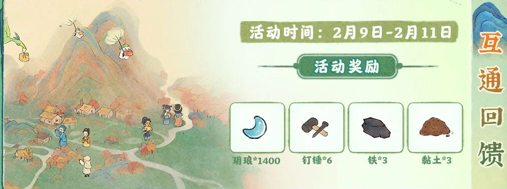 而到了2月9日-2月11日,“互通回馈”活动来袭,在该活动中玩家可获得玥琅*1400、钉锤*6、铁*3、黏土*3的奖励。