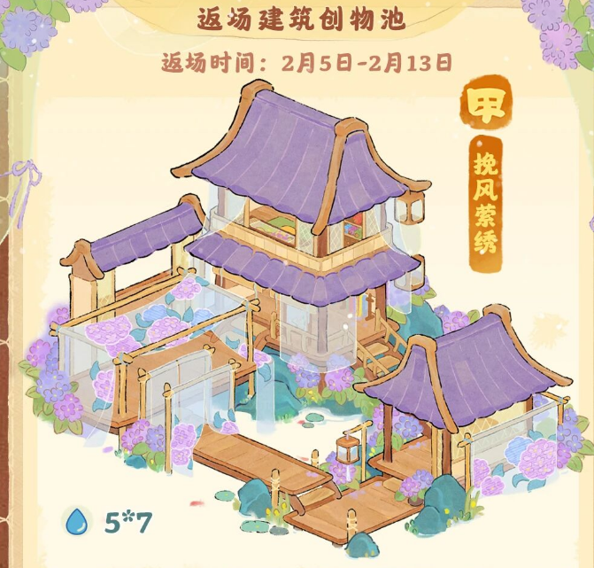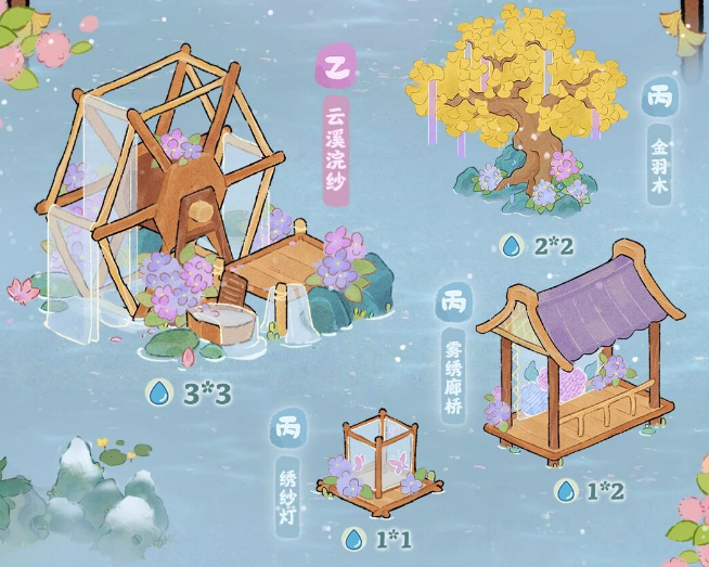除了甲等建筑外,还有乙等建筑“云溪浣纱”和丙等建筑“紫绦金枝”、“绣纱灯”、“雾绣廊桥”上架。玩家可在“绮绣流年”限时创物池中获得以上建筑,装扮自己的萝萝山!