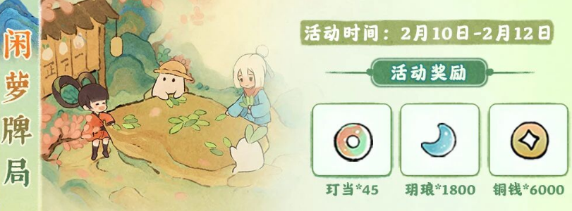 在2月10日-2月12日期间,“闲萝牌局”开启,在该活动中,玩家可获得玎当*45、玥琅*1800、铜钱*6000的奖励。