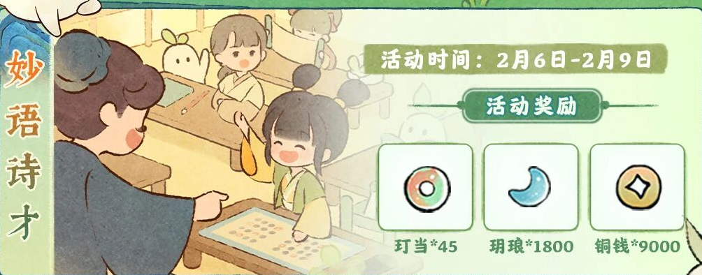 活动方面,在2月6日-2月9日期间,“妙语诗才”开启,在该活动中玩家可获得玎当*45、玥琅*1800、铜钱*9000的奖励。