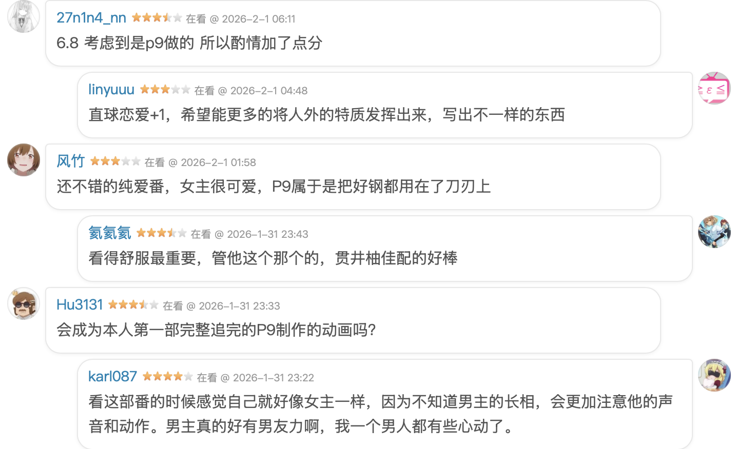各位小伙伴对于P9制作的一月恋爱新番《透明男与人类女~不久成为夫妇的二人~》都有什么评价呢?