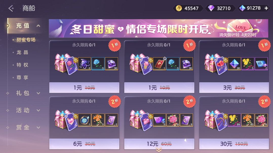 2月11日-2月16日,甜蜜礼包限时直售,甜蜜卡片、龙晶、10级绘卷经验包、热诚之馨、浓意之馨、淡雅之馨、温情之馨等道具你来拿!收集甜蜜卡片可在收集好礼活动领取奖励。