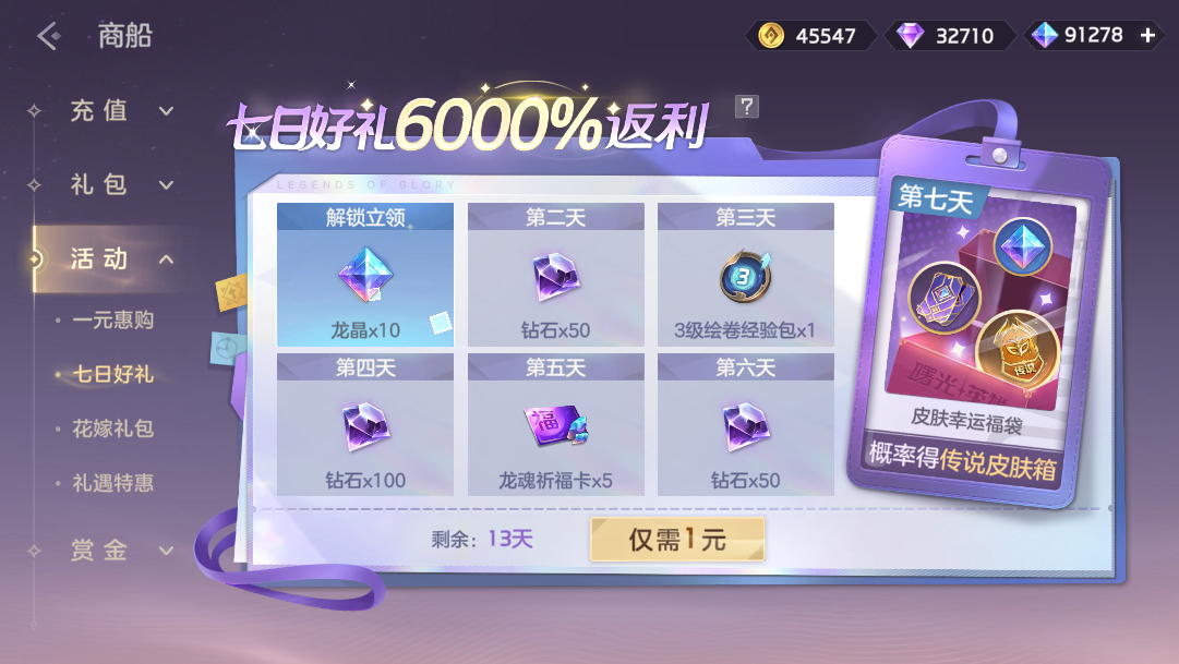 2月6日-2月20日,七日好礼活动开启,玩家付费1元解锁登录活动,登录即可获得龙晶*10、钻石、龙魂祈福卡奖励,累计登录7天可得皮肤幸运福袋。