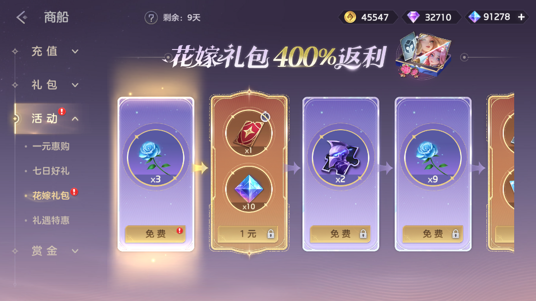 2月6日-2月16日,花嫁礼包限时开启,玩家可按顺序逐步解锁礼包,倾心之约皮肤自选箱、倾心之约头像自选箱、礼券、排位守护卡、热诚之馨、淡雅之馨、浓意之馨等多种奖励,累计可享400% 返利。
