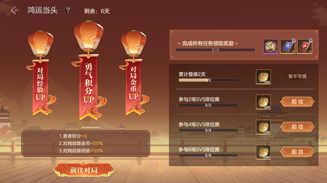 2月9日-2月16日,鸿运当头活动开启,活动期间5V5排位赛结算勇者积分+5,对局结算金币+50%,对局结算经验+50%,完成任务可领取新款限定表情Oi、排位加星卡、排位守护卡。
