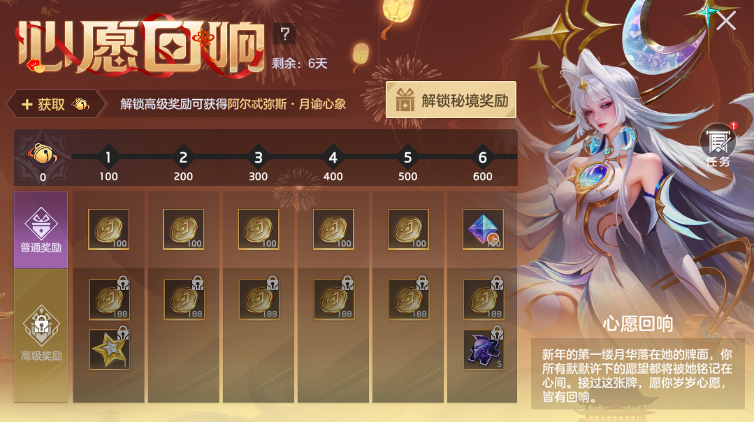 2月9日-2月16日,限时秘境“心愿回响”开启,玩家完成任务提升等级免费获取限时龙晶*300、阿尔忒弥斯·月谕心象1日体验卡、奖励自选包。付费68元可获得新款传说皮肤阿尔忒弥斯·月谕心象、传说星愿、皮肤碎片等;付费128元可获得传说皮肤自选箱。