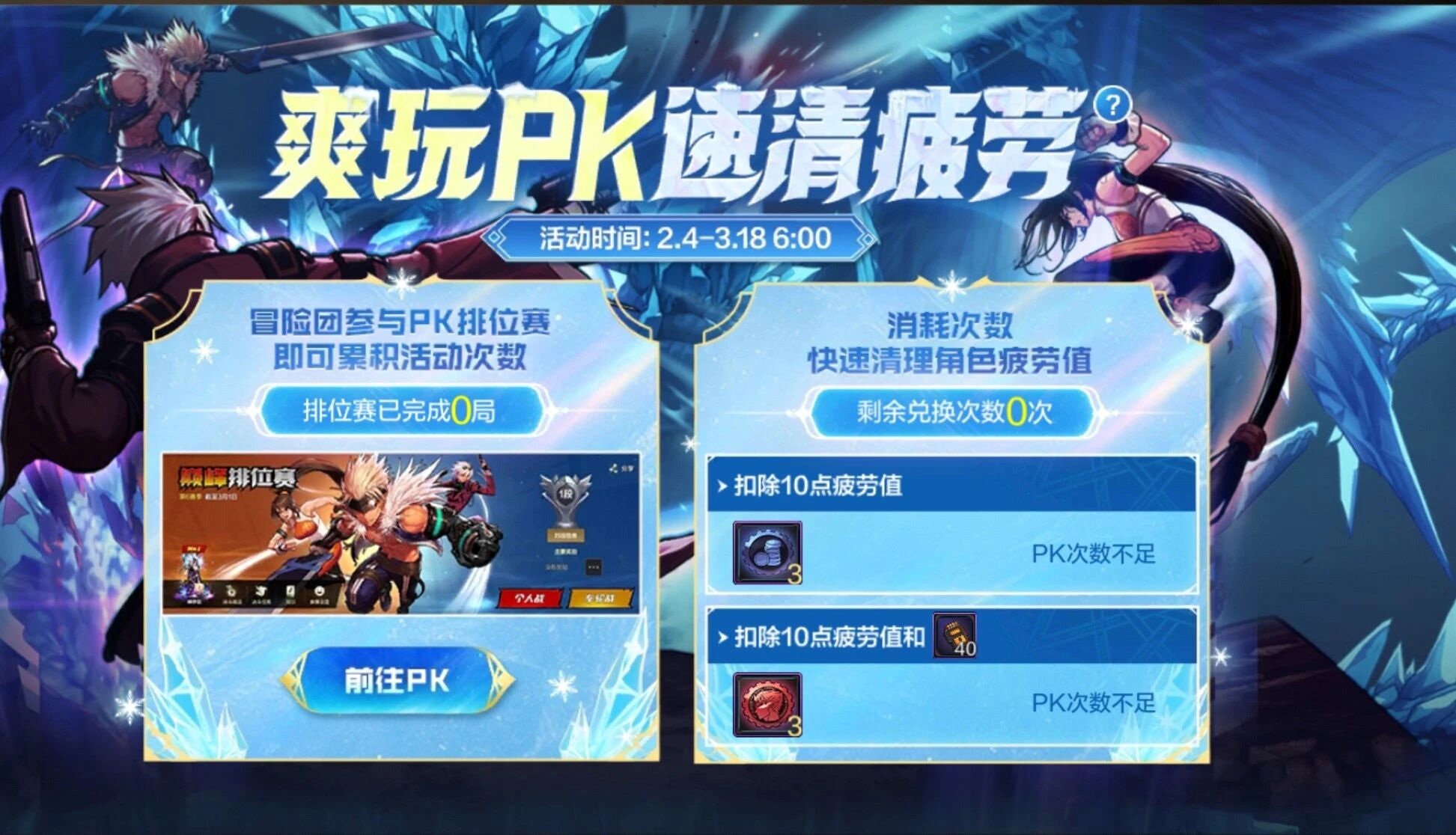 截止3月18日,玩家打PK同样可消耗疲劳值。冒险团每参与1局决斗场对局,可选择让任意角色:消耗10点疲劳值,获得PK勇士币*3,消耗10点疲劳值+征讨地区发电适配器*40,获得PK深渊币*3。