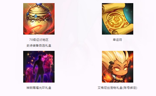其中,天禧灯可兑换荒古遗尘武器自选礼盒(账号绑定)、70级征讨地区史诗装备自选礼盒等珍贵奖励。