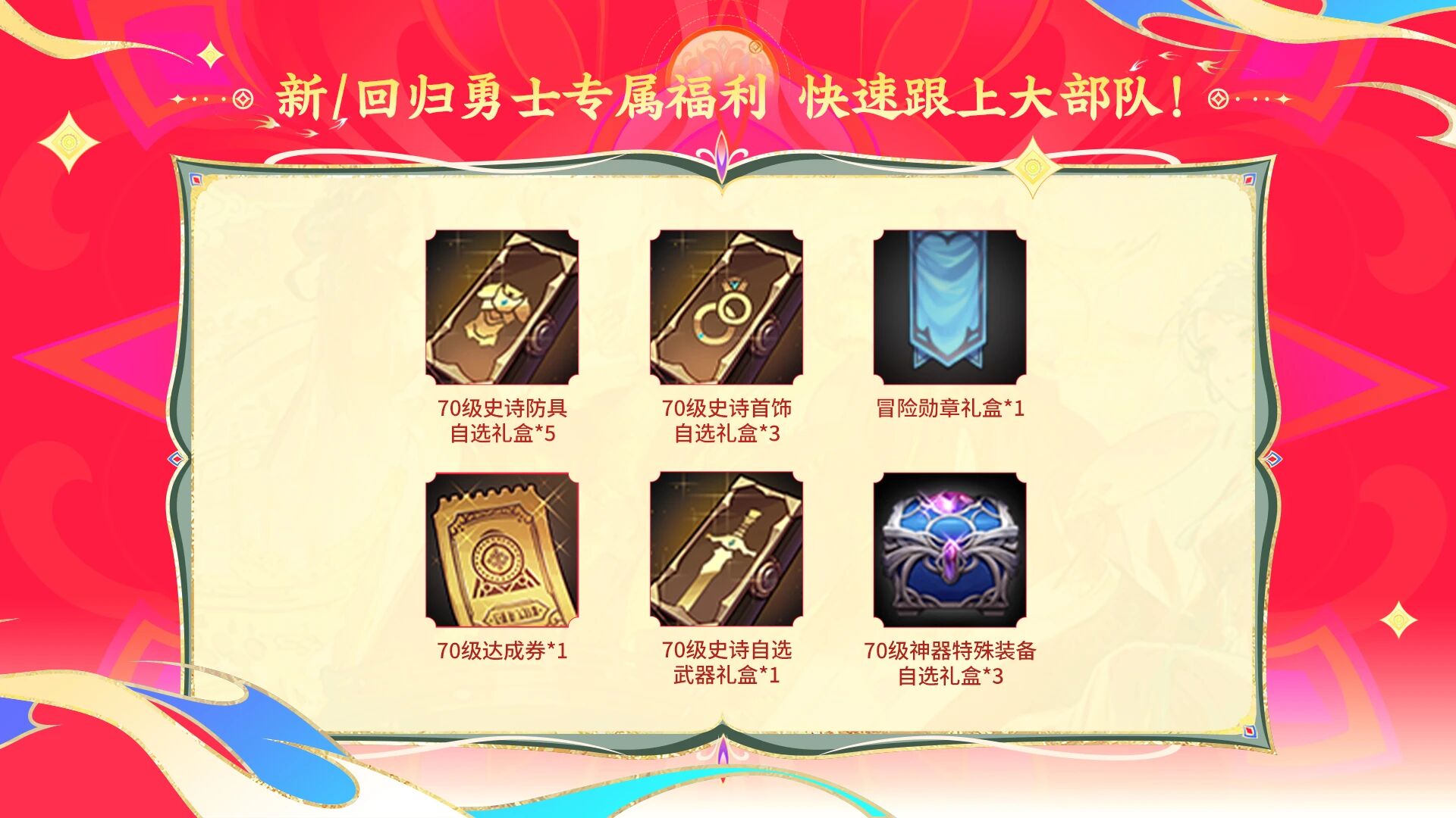 完成后续任务,还可以获得70级史诗武器自选礼盒*1、70级史诗防具自选礼盒*5、70级史诗首饰自选礼盒*3等奖励。
