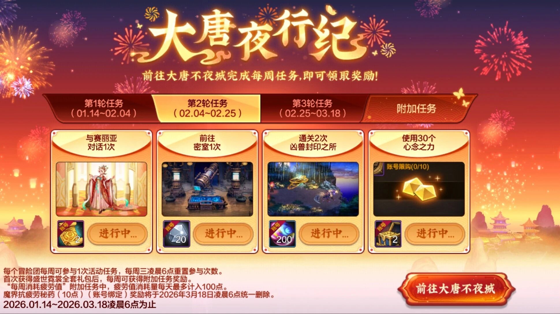 “大唐夜行纪”活动第2轮任务也已开启,玩家完成每周任务可获得幸运符、矛盾的结晶体、炉岩炭等奖励。