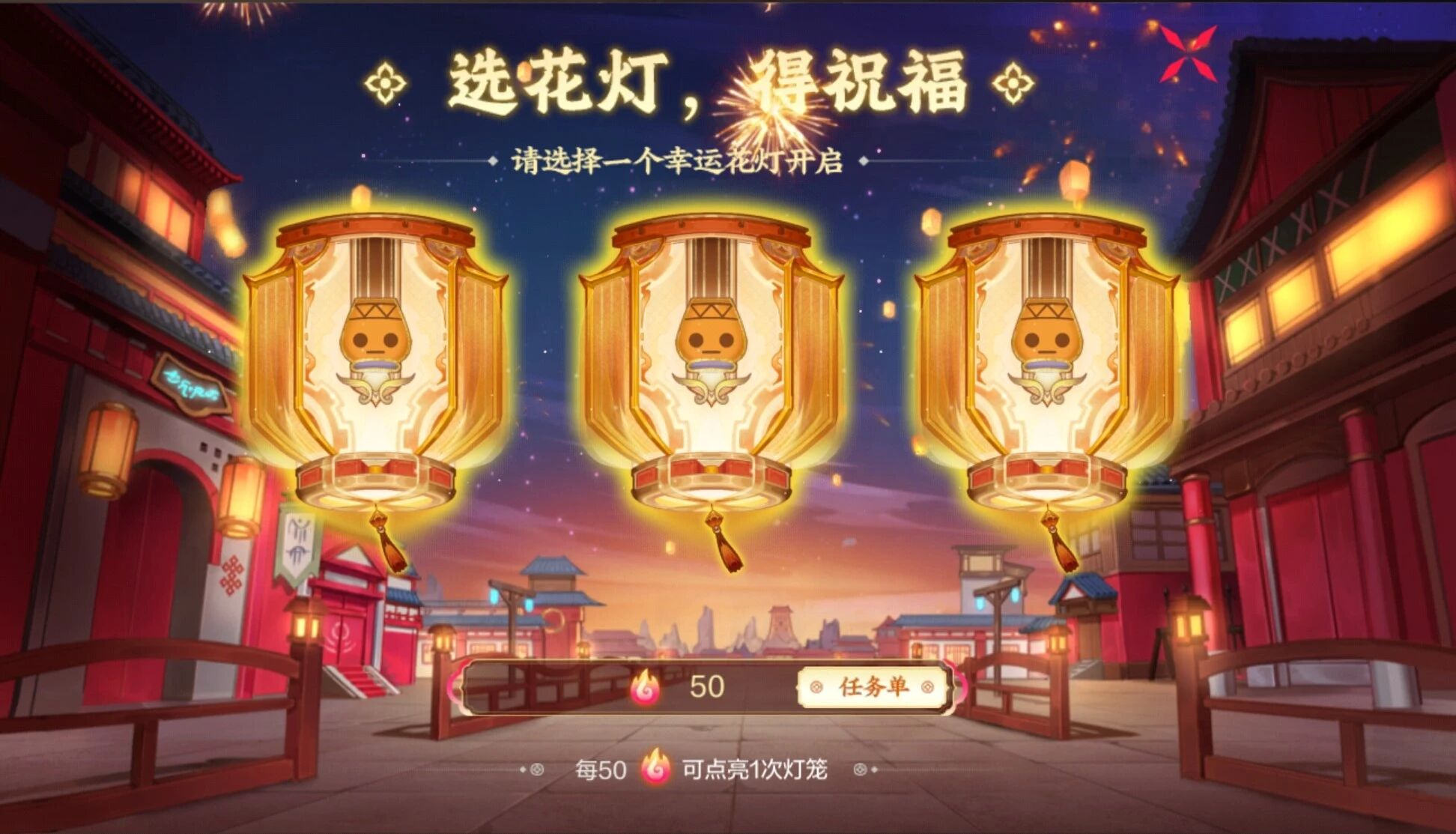 在消耗完200点疲劳值并通关古树奇谭后,玩家可以前往“福灯迎新春”活动界面,领取积分解锁花灯,不同的花灯可兑换对应花灯商店奖励。