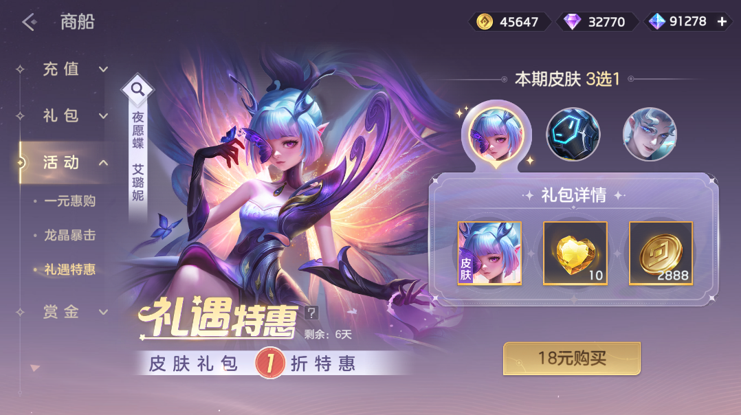 2月20日-2月27日,礼遇皮肤礼包限时1折。仅需18元,玩家即可在艾璐妮·夜愿蝶、法修·头号玩家、伏羲·奇迹大师等三款皮肤中进行超值3选1。