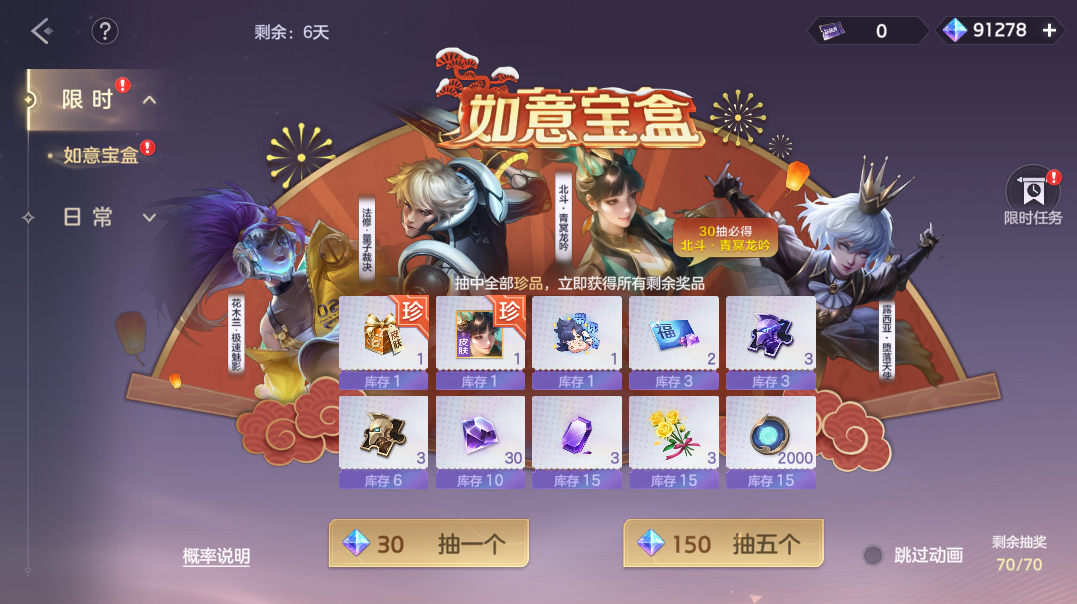 2月23日-3月2日,如意宝盒限时开启,玩家使用宝匣探秘券/龙晶抽奖,珍品奖励宝匣传说皮肤自选箱、新款史诗皮肤北斗·青冥龙吟,高级奖励带你飞表情、皮肤碎片、英雄碎片、钻石祈福卡等你来抽!最多30抽必得北斗·青冥龙吟。