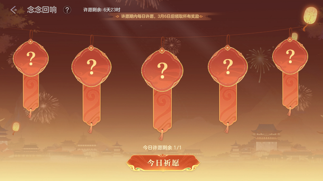 2月23日-3月2日,念念回响活动开启,在许愿期内,玩家每日登录可许1次愿望,最多可许5个愿望。愿望奖励:3日龙晶月卡、3日皮肤月卡、皮肤8折龙晶折扣券、英雄6折金币折扣券、龙魂祈福卡、皮肤碎片、寻宝签等。
