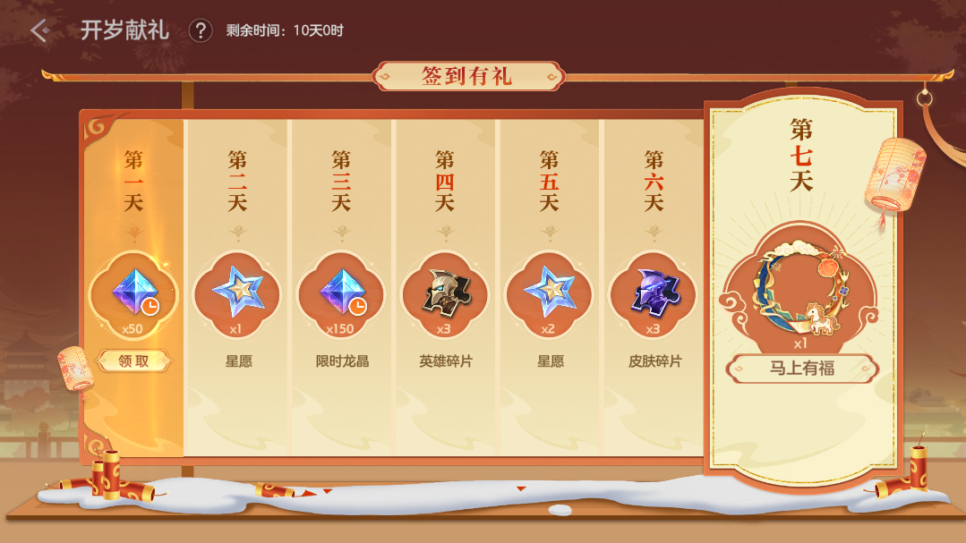 2月20日-3月2日,开岁献礼活动开启,玩家登录游戏,即可获得新款限定头像框马上有福、限时龙晶*200、星愿、英雄碎片、皮肤碎片等奖励。