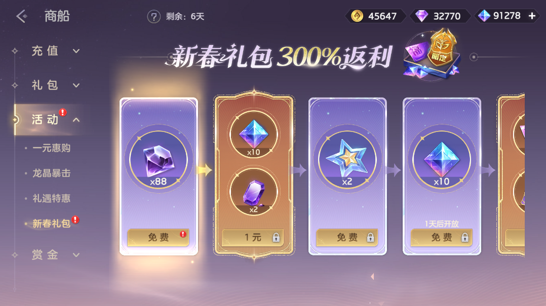 2月23日-3月2日,新春礼包按顺序逐步解锁礼包,传说限定皮肤自选箱、7日组合月卡、龙晶、星愿、礼券、龙魂祈福卡、礼券、寻宝签等多种奖励,累计可享300% 返利。