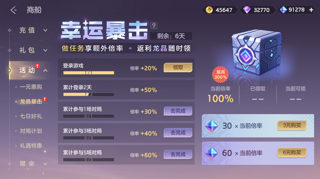 2月18日-2月25日,龙晶暴击活动上线,玩家付费3元/6元解锁龙晶暴击,完成任务可相应获得最高价值3倍的90/180龙晶奖励。两个档位可同时充值,奖励数量叠加,最高可领取270龙晶。