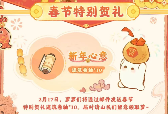 2月17日,春节特别贺礼上线,游戏将通过邮件发送春节特别贺礼建筑卷轴*10。届时请大家留意领取。