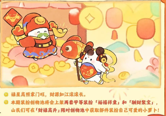 而在2月20日-3月6日,“财禄时绥”建筑卡池将限时返场,“开运鉴宝”活动限时开放!消耗萝卜币砸开元宝后即可获得丰厚大奖,奖池内含请神符(更换“财禄时绥”建筑内财神神像外观的道具)、头像框、萝福来装扮套装“红包拿来萝”等精美大奖,以及乙等建筑“待月廊桥”、“薜萝山门”、建筑卷轴、装饰卷轴、玎当等奖励。