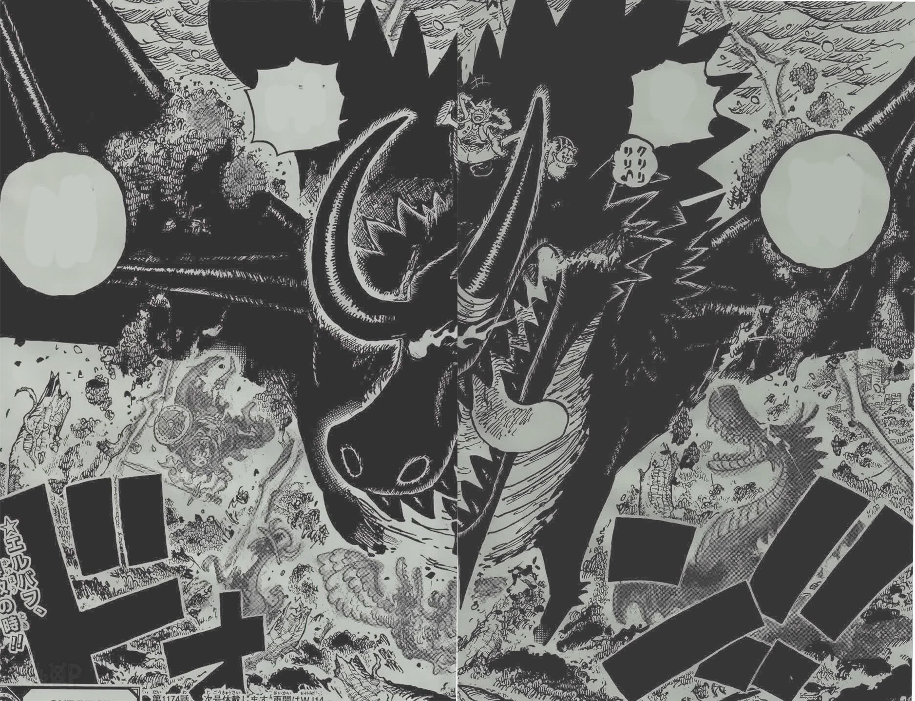 洛基将巨人孩子们和他们的亲人们送到了安全的地方,然后摧毁了许多梦魇怪物们。与此同时,岛上开始响起“解放之鼓”的鼓声,巨人们、索玛兹愤怒、伊姆/军子都在震惊观察着。在最后的震撼跨页中,五档路飞和松鼠铁雷站在洛基的头顶上。亚鲁鲁震惊说出预言:“在闪电的暴风雪之日,一头巨兽出现遮蔽天空,伴随着解放之鼓……‘太阳神’降临!”