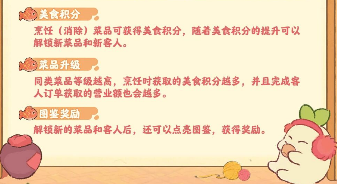烹饪(消除)菜品可获得美食积分,随着美食积分的提升还可解锁新菜品和新客人。同类菜品等级越高,烹饪获取的美食积分越多,并且完成客人订单获取的营业额也会越多。解锁新的菜品和客人后,还可以点亮图鉴,获得奖励。
